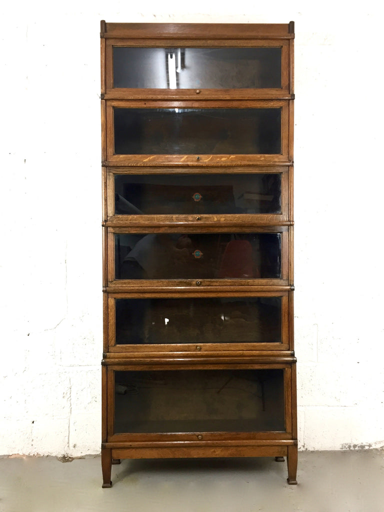 6 sections (1 large, 3 medium, 2 small) with Globe Wernicke trade mark 'up and over' glazed doors, separate base (rare 4 legged version) and top cornice. Makers marks to the inside.
